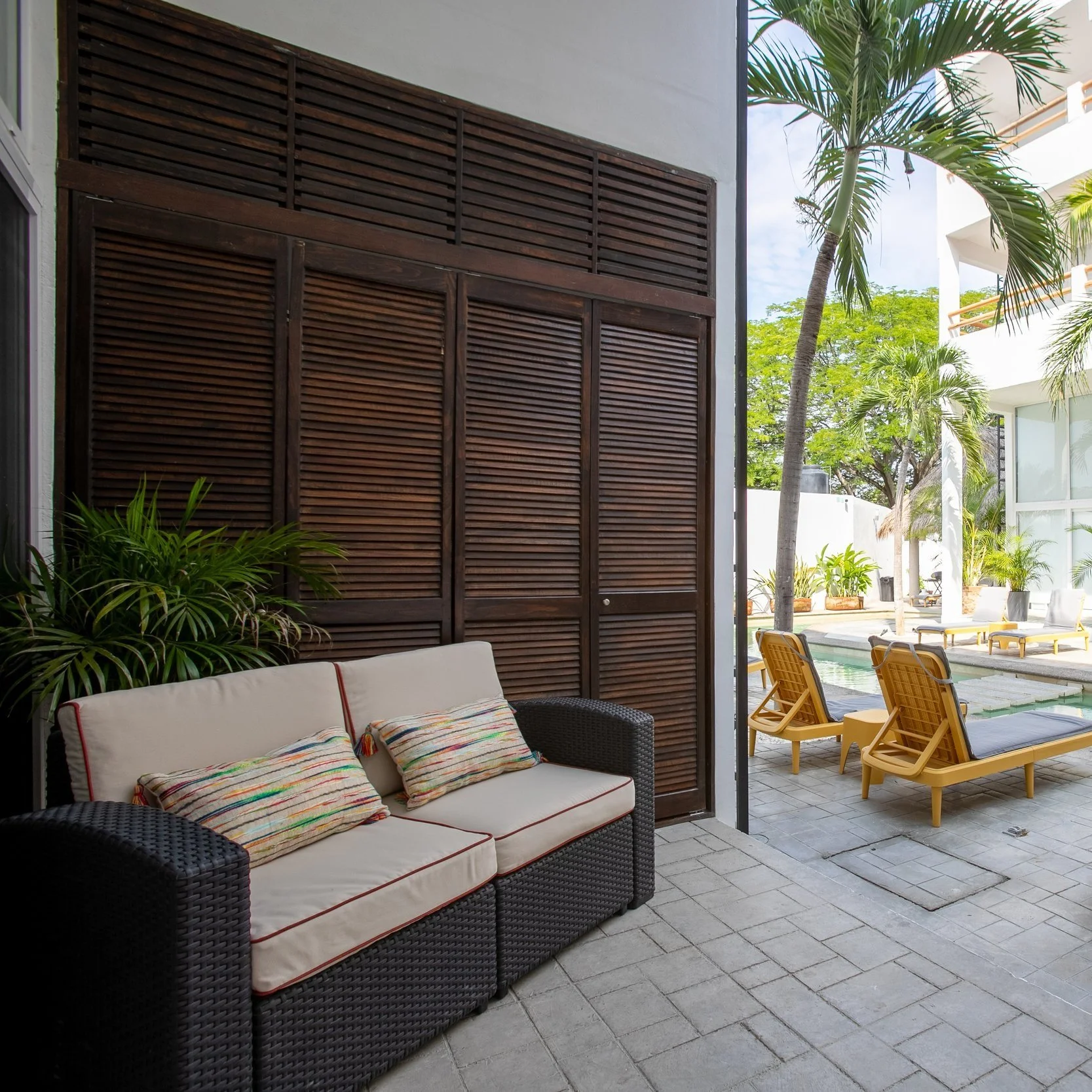 This large studio unit is tucked a bit out of the way on the property. Very private with the largest of the studio unit balconies. Including a queen bed. There is plenty of room for short or long-term stays.